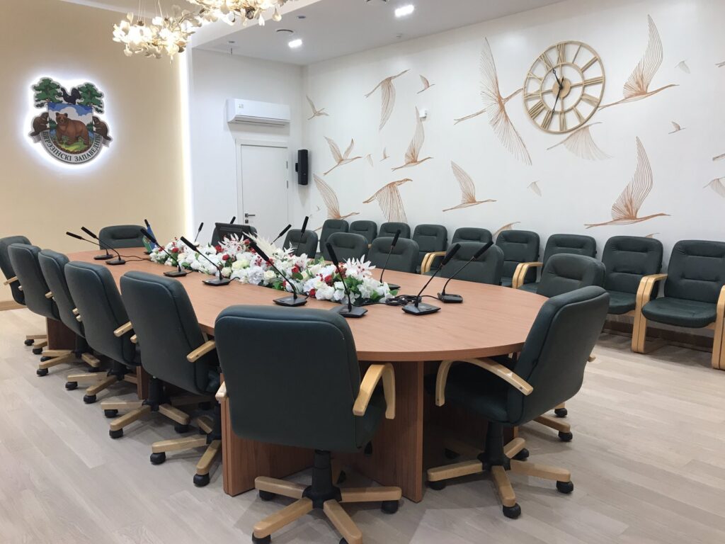 - Пресс-центр с овальным столом на 40 мест для проведения заседаний небольших групп специалистов, пресс-конференций, приема иностранных делегаций, представления презентаций, видеофильмов с использованием современного компьютерного оборудования;