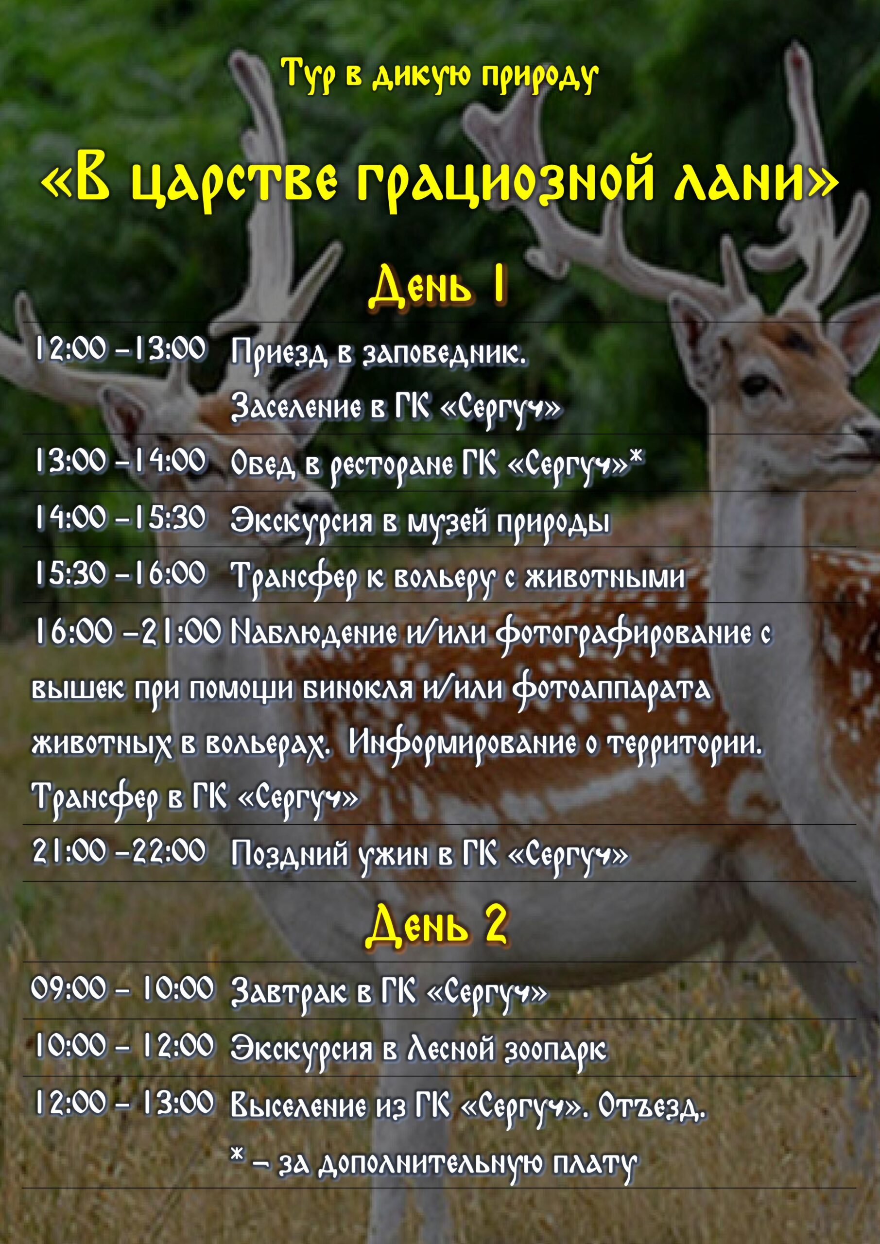| 15:30 — 21:00 | Наблюдение за животными с наблюдательной вышки (посмотрите на грациозных ланей в угодьях просторного вольера) |